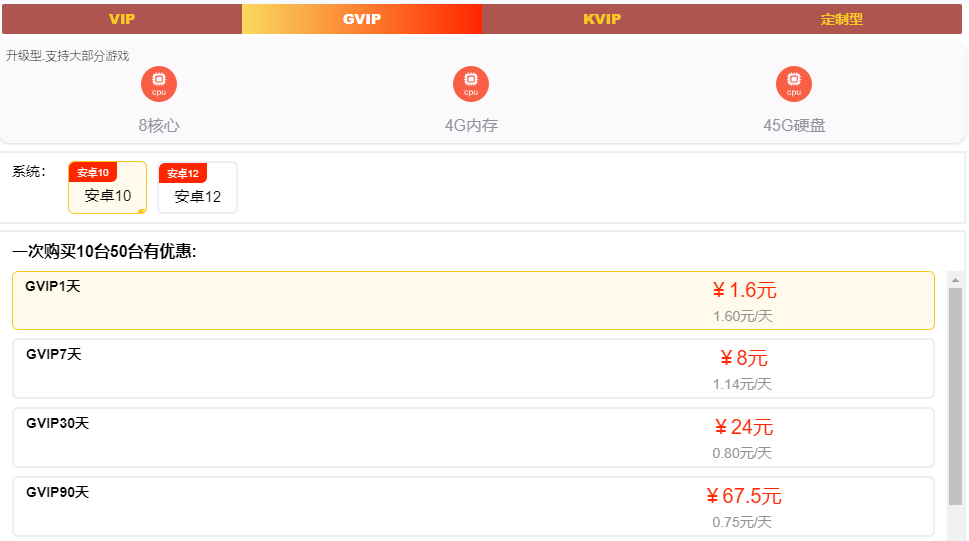 2.然后购买云手机,推荐购买GVIP以上配置(游戏流畅较好适合自用、代挂接单)