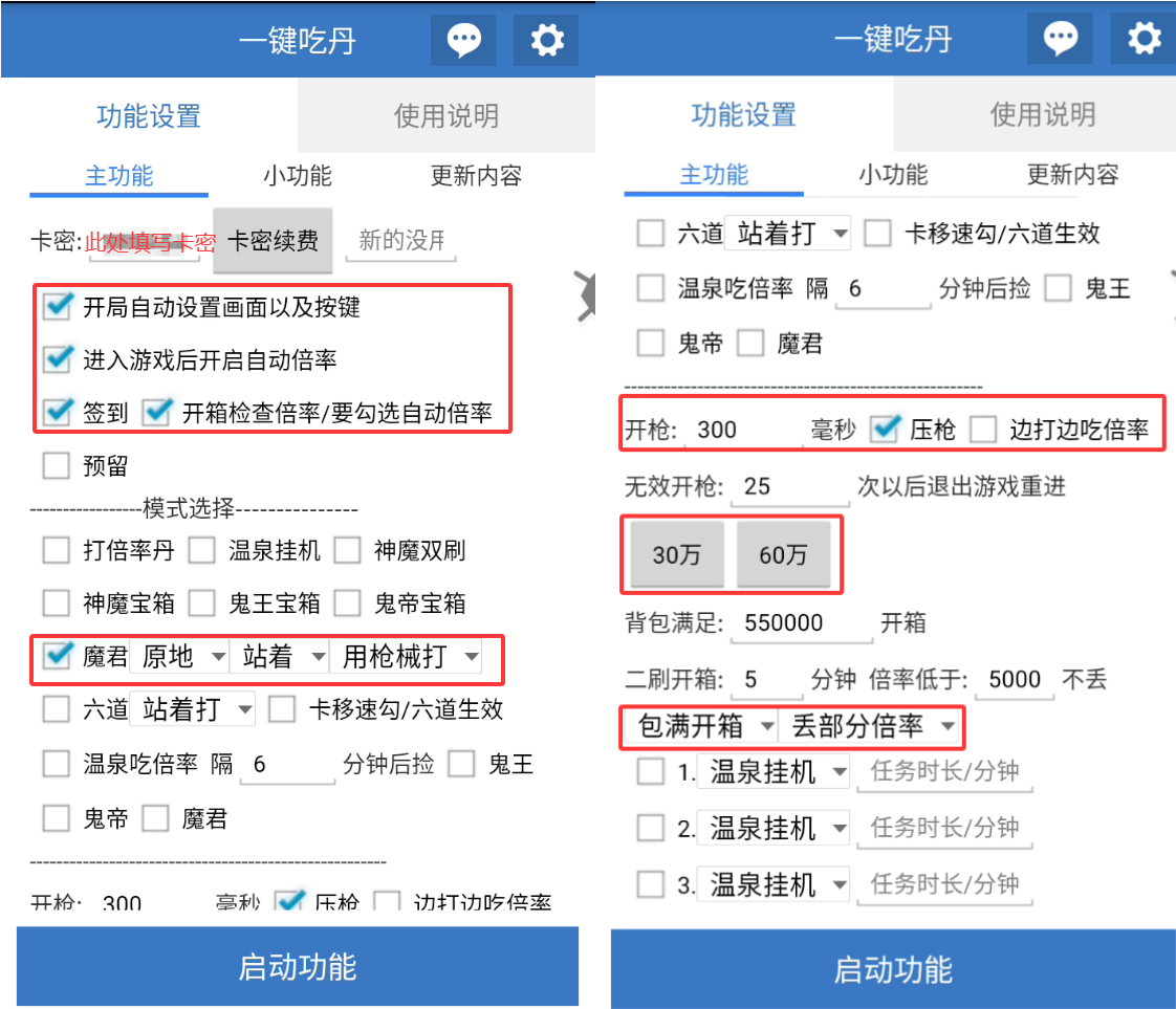 8.开启完成后,返回云手机桌面设置脚本。以魔君为例子,勾选魔君,边打边吃倍率丹,选择背包容量,选择包满开箱丢不丢倍率丹,设置好点击脚本下方启动