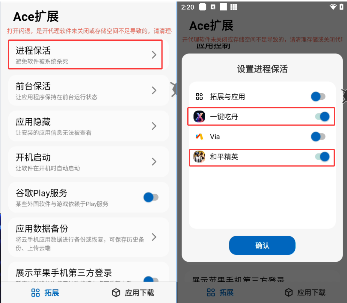 6.安装完成以后,找到应用与拓展,给和平精英和脚本添加进程保活(保护游戏防止闪退)
