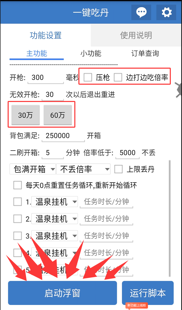 6.设置完后,自己勾选是否选择边打边吃,和自己的背包容量就可以啦!点击启动浮窗,登录游戏,在侧边栏启动脚本即可