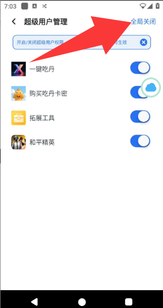 3.下面打开云手机里面的【拓展工具----ROOT管理-----给一键吃丹授权】不需要给和平精英授权,如果是全部打开的状态,右上角有一个全局关闭,关闭后只给一键吃丹授权即可