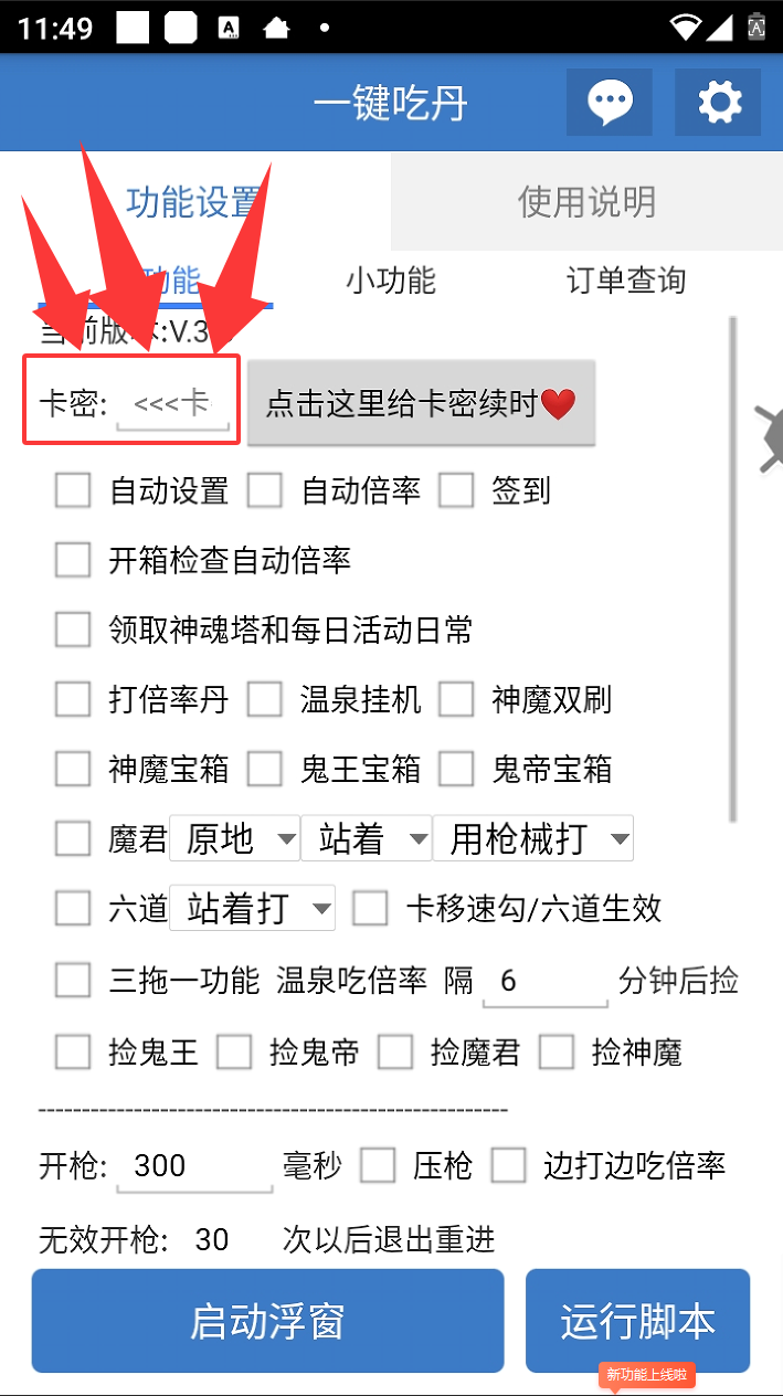 4.返回云手机桌面,打开一键吃丹APP,填入你购买的卡密(第一个空)
