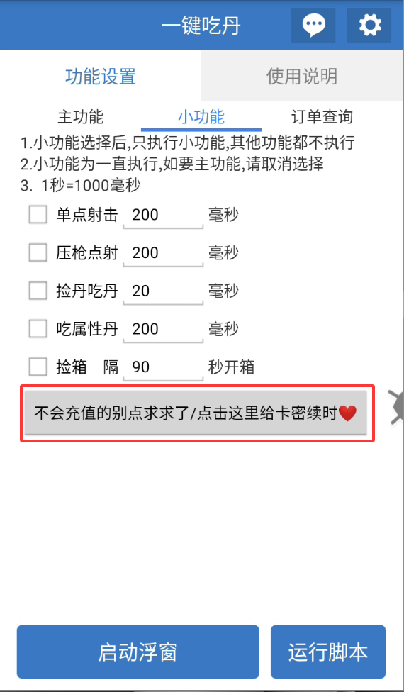 卡密续费需要将新购买的一键吃丹卡密填入到续费框中,卡密续费功能已移动到小工具中