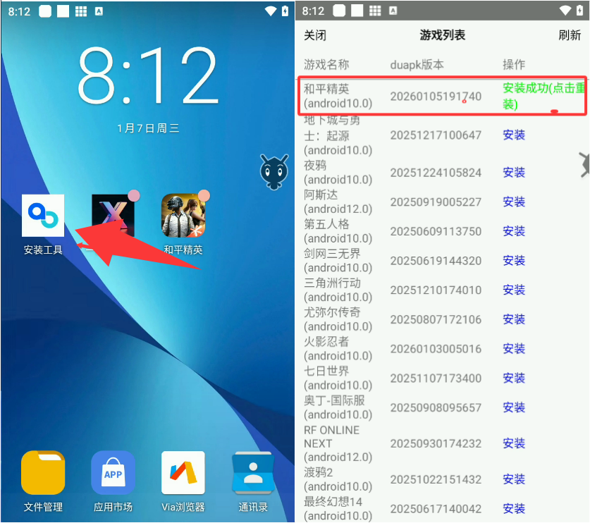 领取到云手机后打开你的云手机,找到桌面的安装工具,安装和平精英