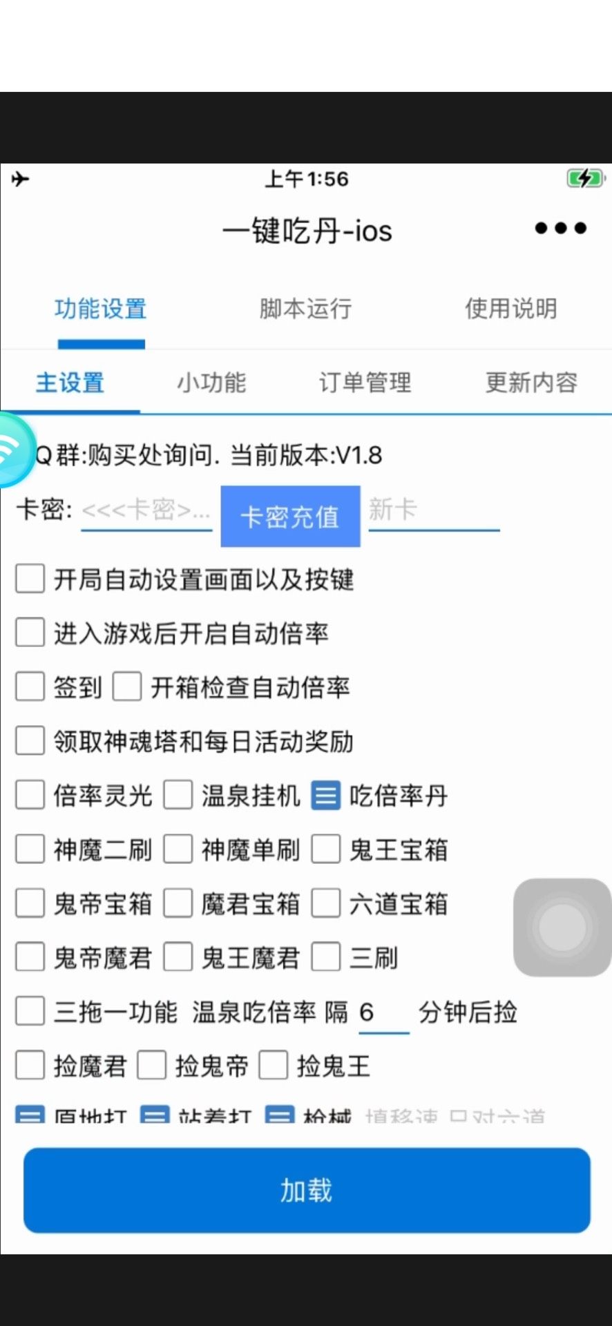 打开修仙助手,填入购买的卡密,选择好功能就可以点击加载了